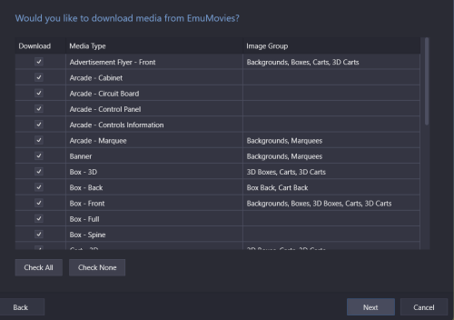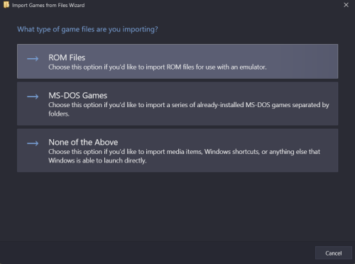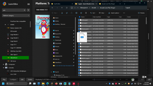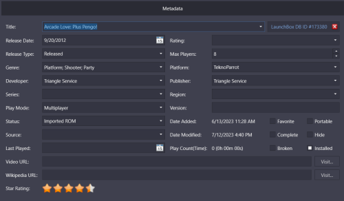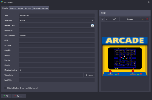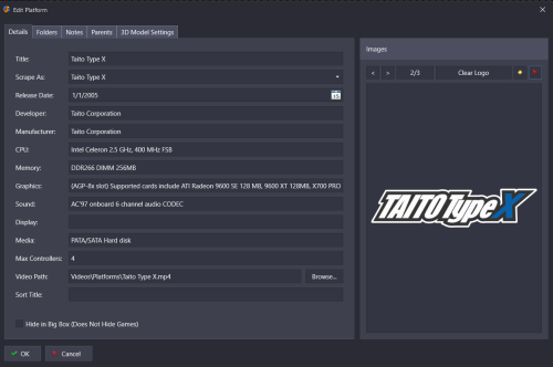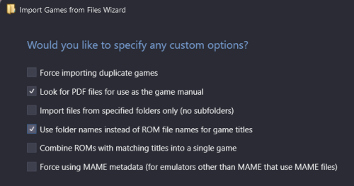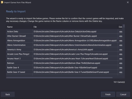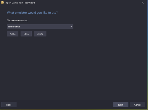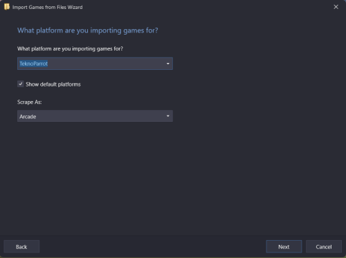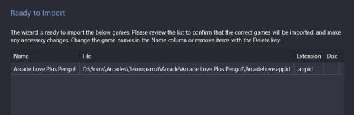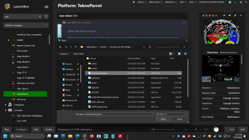 my emulator settings. I use dummy files to make this work Platform Settings. I have the Games mainly separated into 2 folder one for Arcade and one for Taito Type X, When you look up TeknoParrot games on the GamesDB these are the 2 platforms you find them in. Find the Game on the LaunchBox GamesDB Name the folder to mimic the LBGDB Then inside of the Game folder I create a dummy file that matches the TeknoParrot User profile file but with a .appid file extension. The User profile file gets created after adding and setting up the game inside of the TeknoParrot UI. Now to just import one game at a time just drag and drop the appid file into LaunchBox or Tools - Import - Roms - Add File and locate the appid file If you would like to import a whole batch of games at once. For the TeknoParrot Arcade platform. Go to the TeknoParrot Arcade folder in File Explorer and search for *.appid. Wait for spinning wheel. Select All and drag and drop into Launchbox. If you have Launchbox open to the platform you are importing it makes it easier Now we are in the Import Wizard in LaunchBox. Choose Rom Files. The Platform options. The Emulator Options. Use the files in their current location. Keep going through the wizard. Choose the options you would like. Emumovies options. Now on this next page make sure to check Use folder names instead of rom file names... and the final of the import wizard. Single Game. Batch of Games if the folder names match the GamesDB you get nicely added games and can match EmuMovies too. If there are entries in the GamesDB and/or EmuMovies you'll have the metadata and artwork.