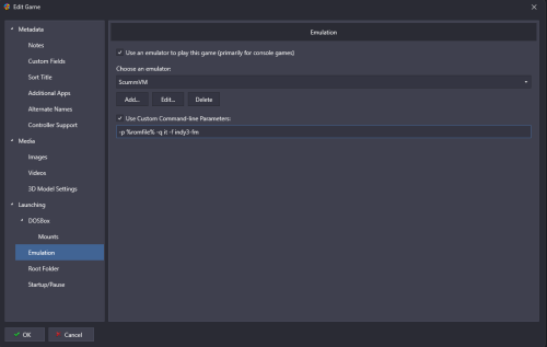 Hello, I decided to fix the whole scummvm library after the launchbox update. Most of the games works fine but some do not start via launchbox, however they work fine if I start them directly via the emulator. Some of the games in question are fm towns titles in Italian language (patched), the same games in English version works without problems. Indiana Jones and the Last Crusade - The Graphic Adventure = ERROR: Bad ID 0000 found in index file directory! Loom = ERROR: Cannot find file: '90.LFL' ! Maniac Mansion Deluxe = Starts in english even if i set the italian language in the emulator game settings. Does launchbox have its own configuration, independent of the standalone emulator? I ask because it seems to be a problem of IDs or checksums not being recognized/matches, but if it were a problem with the emulator, they wouldn't even start through the emulator itself. Thanks EDIT: Ok i fixed it using custom command line parameters in the emulation section of the games that had issues. Ex. for Indiana Jones and the Last Crusade - The Graphic Adventure (FM-TOWNS version): -p %romfile% -q it -f indy3-fm Where -p is path to file, -q is the language, -f is for full screen and indy3-fm is the game ID.
