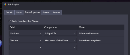 24. Is this function still working? For my Famicom platform I have an auto playlist that looks like this: But it doesn't seem to be working; all games for that platform are included in the playlist.