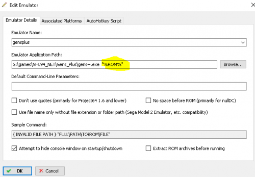 1. Hi All Dont want to use retroarch Want to use SNES9X for SNES and GensPlus (or KEGA FUSION ) for megadrive / genesis In the command line that calls the games what are the placeholders for the rom name for SNES and GENESIS emulators please? ie snes9x.exe %ROM% or %ROMNAME% gensplus.exe %ROM% or %ROMNAME% Im just giving an example by those 2 (which are wrong) of what im looking for - what are the correct ones please ? see screenshot too