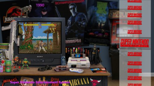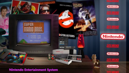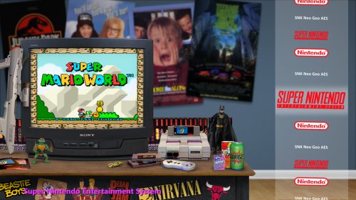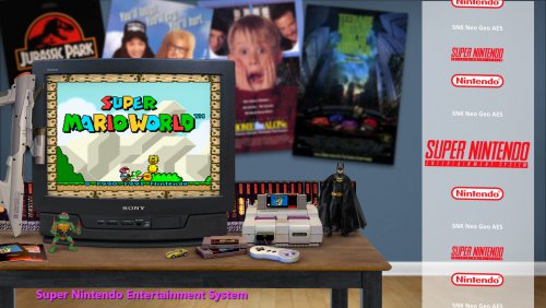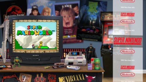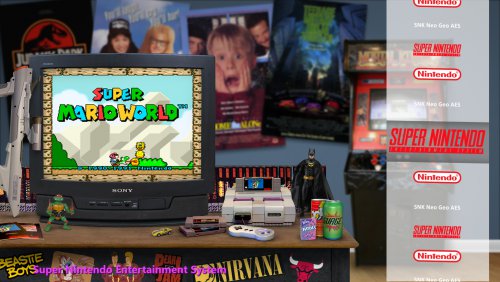 Hallo...just gauging if there's any interest at all in a theme I'm messing around with. Basing it off skainlurmis 's New Retro Big Box Theme. I like his theme but decided to tinker around a little and make it look like the consoles are in rooms that would match the decade of the console. Here's two that are a work in progress...One is for the NES. I didn't change the table/tv and a couple other elements that were already in the NRBB theme..just the wall, a new NES angle (i know the controller is cut off, was just for positioning purposes) and the posters/items/toys. The SNES one I started from scratch with a new table/tv and all that so that's why its brighter lit up than the original NRBB theme which has the darker arcade setting/lighting. Any other suggestions/comments? Doesn't necessarily have to be a bedroom...could be any room but using a blank wall as a background with some flooring makes it easier to use posters of the decade in the back. If there's no real interest that's ok..I'm still going to do them for my own use Here's the two samples. Work in Progress and I've never created a theme before so be gentle lol. EDIT: Added an update to the SNES pic...didn't like the table open on the bottom so closed it and added some stickers...also some soda and candy. EDIT 2: 4th image added for SNES...is the actual arcade game in a room too much? I figured this person loves games and may have an arcade in their room too.