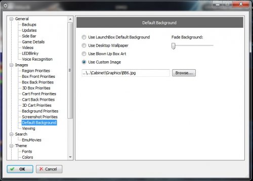 Hi Maddoc, Sorry. been busy these past few days. Time to get back on our little project. I downloaded your files and named it Default Vertical but I still have 2 little bugs. 1- As I posted in my last post, I still see box covers in the wheel below and not the clear logos. This is the screenshot of my BB options >> views section just in case the bug would come from there.. 2- Next, regarding having my Merlin background in BB I went to that section you talked about here Tools>>Options>>Images... And that's what I got...However, my background does appear in the back but in Launchbox and not in the background of BigBox. Rights now I still see the clear logo of Dig Dug as the game background and not my Merlin BK. Hope you follow me here.. So where can I go in BB to do what I just did for LB and make my Merlin logo in the background of BB too for BOTH the platforms and games list? Thanks again, Merlin -