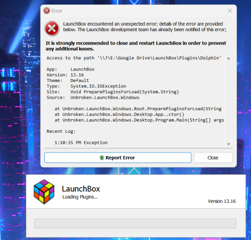 @AstroBob It's always the Plugins folder. If I delete one plugin and relaunch, the very next one will be the culprit. My LaunchBox directory is hosted on Google Drive. It's on a local drive and mirrored in the cloud.