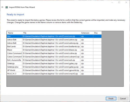 Hello, I've read the numerous posts and tutorials on Daphne configuration, but haven't been able to get the ROM import working well. It seems that when I go through the Import ROMs steps in Launchbox, when I get to the confirmation screen, it only lists some of Daphne laserdisc games and not all of the ones that I chose to import. It also doesn't match up the games quite right. This happens whether I choose the ROM zip files to import or the .TXT framefiles. See the attached screen shot of the games it seems to pull. Notice that it is missing Dragon's Lair, Us vs Them, Interstellar, Roadblaster, Super Don Quixote, etc. Also it seemed to get Star Blazer, Galaxy Ranger, and Space Ace matched up to incorrect games. Am I doing something wrong? It just seems to not be able to match up. I'm choosing to scrape as Arcade platform (since these are arcade games, and there is no Daphne or Laserdisc option to scrape as). Any help would be appreciated.