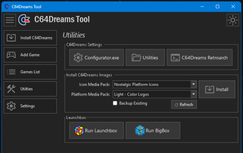 Hi Folks. I wrote an app as an add-on to Zombeaver's excellent C64Dreams project. Features: Makes installation into existing (or indeed vanilla) Launchbox installations a lot easier (fully automated). Automates adding other C64 games to the C64Dreams collection without having to mess about with .bat, .vbs, .ahk files. Also automates adding to the Launchbox database (not having to add it manually). Lets you search the C64Dreams collection for specific games in-app rather than having to launch Launchbox each time. Fixes broken Images for Platforms, Platform Categories and Playlists. Also lets you use your own images and automates the installation to launchbox process (GIMP template attached to this post for convenience). The C64Dreams Project: C64DreamsTool Pics: C64DreamsTool video: C64DreamsTool Downloads: Github: https://github.com/stigzler/C64DreamsTool/releases/tag/Release Images XCF: PlatformLogos.xcf