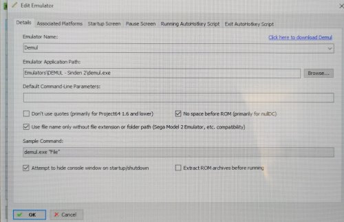 Hi guys I have my build sorted for lightguns and all i am trying to do is add house of the dead 2. I have started using Demul, and set it all up so when i open Demul indepentantly of launchbox, then select HOTD2 it loads, fine.... I have added it to Launch box, when i double click it it simply launches Demul and sticks there. Nothing on my build uses Demul, ONLY HOTD2 and these 2 screens shots are how i have the emulator set up : I have also seen a topic in here where someone suggests using a Batch file with this command inside "demul.exe -run=naomi -rom=hotd2" - If i turn off "use an emulator" and point the launchbox title to this Bat file it starts Demul and then loads HOTD2 fine!..... However......... i cannot use ESC to exit the game like normal because the Emulator had a running AHK script within it(which is now turned off).... Also, an odd thing but my Player 1 no longer starts the game when going this way (P2 works fine however). It seems i keep getting so close but just cannot get it 100% - I also added DemulShooter as an additional App but thats not linking but i can deal with that once its running and closing properly. Please help ! I just need HOTD2 running with Sinden on here for a party in a couple days. Sounds crazy i know, it means a lot to the chap. thanks