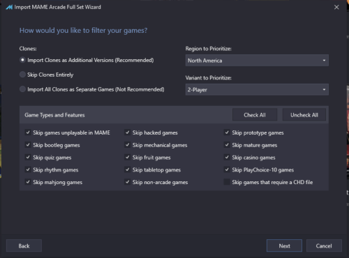If you use the LB defaults for the full set importer then the defaults will already exclude gambling games. The default settings only import Arcade games. The image below shows the standard default check boxes (disregard the Region and Variant priorities as those are not defaults). The gambling games typically fall under Casino.