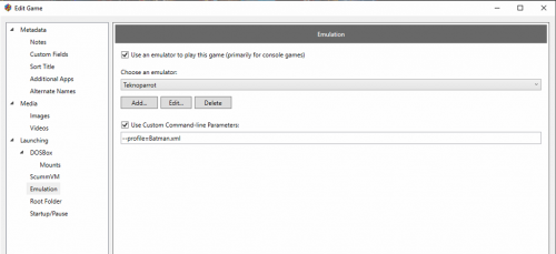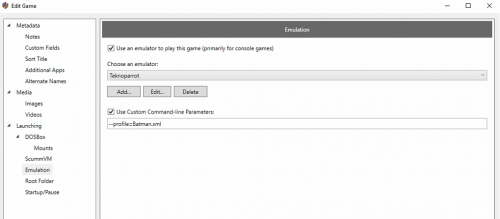 Glad you are sorted, but curious how you are setting up TeknoParrot you need to edit those fields. I have a bunch of games running in TP and do not use those fields, plus they are greyed out since I am using TeknoParrotUI.exe as the emulator. Below is pretty much how all my TP games are set and running. -