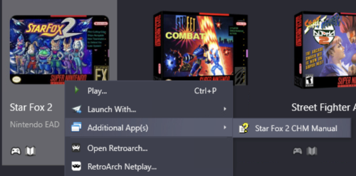 LB will open the chm file but you either have to have it shows as an "Additional App" or just drop it in your SNES manuals folder and name it exactly as the game is named "Star Fox 2.chm" and it will show up in the display manual submenu. If it were a pdf you could add it as an additional app and LB would then show it in the "Additional Documents" menu. I do not believe the additional documents supports other file formats.