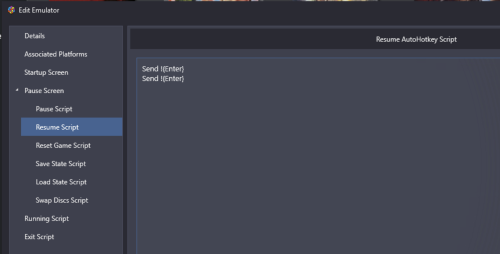 So the keys clearly work. So now can you edit your PPSSPP emulator in LB >Tools >Manage >Emulators and edit PPSSPP. In the "Pause Screen" section go the the "Resume Script" tab and paste this into there. Remember, not very elegant code but it will at least confirm you can return to full screen from Pause. Send !{Enter} Send !{Enter} Should look like this. Then test. Does it work at all?