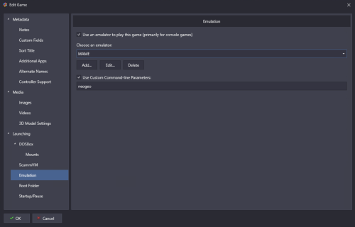 1. Make sure you can get the rom to run in Mame first. You have to edit the negeo.xaml located in Mame's \hash folder and add the correct game information to the end of the document. Looks like you already have this part done. Now: 2. Manually add the game to your arcade. I recommend selecting an emulator other than Mame when you add it as during import this will make sure the Mame meta does not prevent you from importing it. 3. Once added right click and edit the game. In the Emulation tab change the emulator there back to Mame. Then click the option to "Use Custom Command-Line Parameters". In the cell below that simply add "neogeo" there (leave out the quotation marks). I did not have this set-up since I use the Dreamcast rom and it took me some trials. Thanks to @JoeViking245 I was able to locate a typo that was preventing me from getting it working. Not to difficult, but when you type stuff wrong it can become harder than it needs.