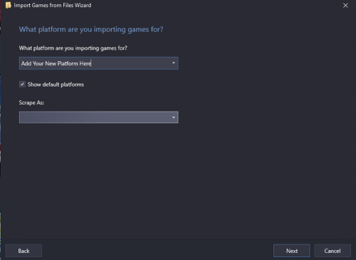 When you import the rom the import wizard UI will open a screen for you to select "What platform are you importing games for?". In the drop down box simply type the name of the new platform you want to create (you can click in the box and type you are not stuck to only using the populated drop-down items). Then in the "Scrape As" field you can leave it blank or select the original platform to scrape that the original rom is from. That part is up to you as leaving it blank will bring no metadata. LB Games DB does not have metadata on Rom Hacks.