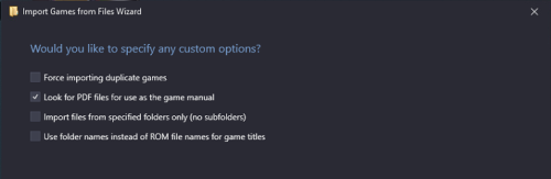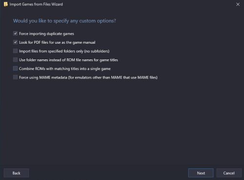 LB should not be duplicating games already added to a platform. Can you give an example of the platform it is doing this with and clarify how you initially added the first set of roms and how you are trying to add the new one? Also post a pic of the contents of that platform's rom folder. LB does do this. As you can see I just tried to import the 5 games shown in the top row and at the end LB shows it is not importing anything since it recognizes those games exist. This is why the "Force Import Duplicate Games" option exists as a check box in the Import Wizard.