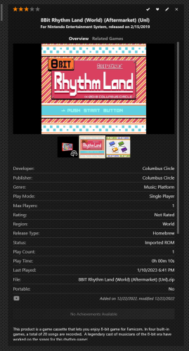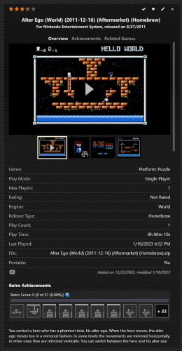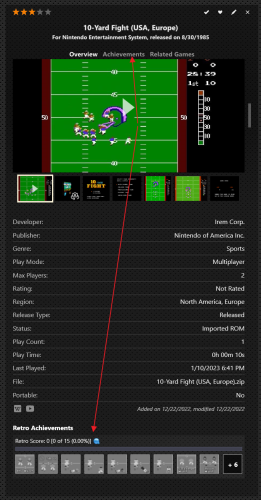 20. Occasionally, a game that has achievements doesn't indicate that within LaunchBox. Is there a way to create the relationship so the available and completed achievements will appear? I'm not exactly sure how LaunchBox knows when to show the panel and tab or not. This game for example has achievements and will work just fine using RetroArch with this version of the game. https://retroachievements.org/game/17691 This is the data that is missing. Any help would be appreciated.
