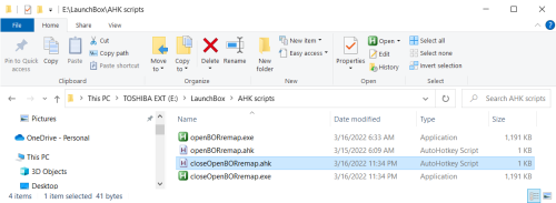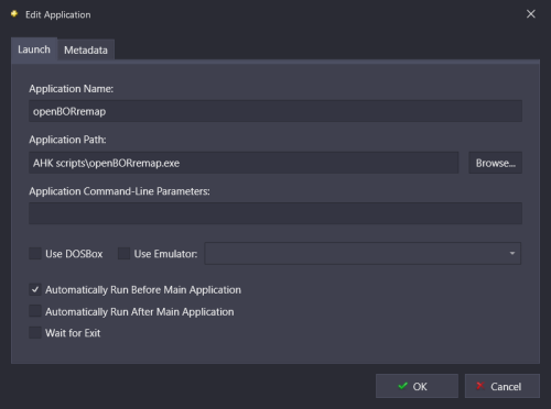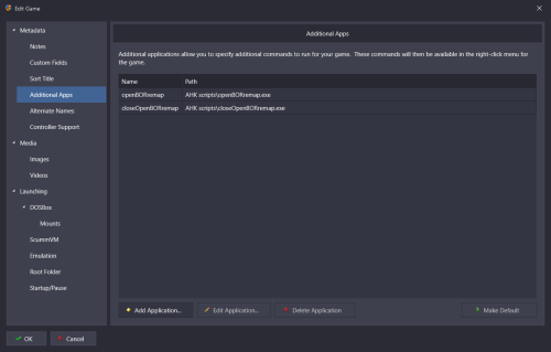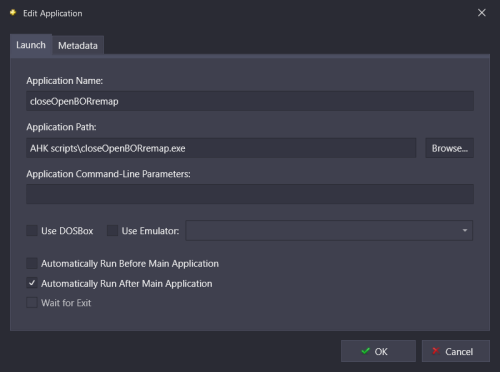 12. if you want to keep each games inside its own package like this you can run additional apps per game just compile your ahk to an exe openBORremap ahk n::a o::s r::z s::x m::d q::f a::n d::m x::o z::r f::q Esc::ExitApp ; Exit script with Escape key close openBorremap ahk Process, Close, openBORremap.exe This works for me and took awhile to get it all figured out, hope it helps