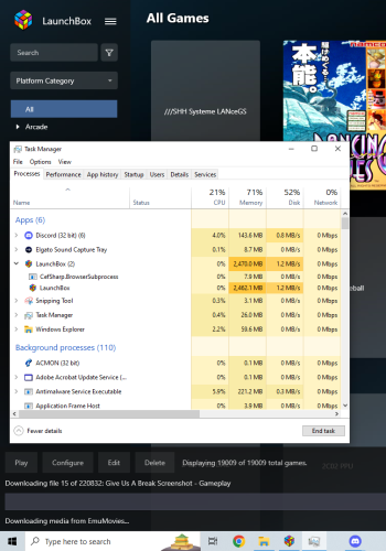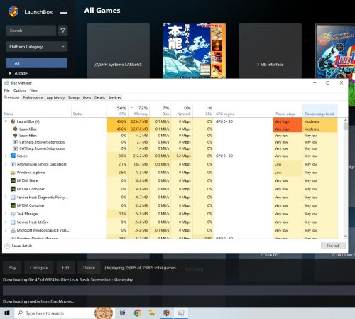I had posted this in the discord but didn't get a response back so I'm gonna try here. I am importing a full Non-Merged MAME set into LaunchBox. The process seemed to go fine and downloading media from the LaunchBox Database seemed to go smoothly. However, when I get to the part where it downloads from EmuMovies (I am a lifetime member over there) the downloads practically stall. Like I don't see it downloading anything and it appears it is stuck. But it isn't stuck because I let it run overnight and when I come back it is waiting on a different media file. So progress is being made. However, when I go into Task Manager, my CPU, Memory, and Hard Drive usage seems unusually high (I have 2 hard drives in my laptop so a 50% usage on my hard drive means that my D drive, where my Launchbox folder is, is at 100%). I try to just let it do it's thing but sometimes when I start using my computer for other things while LaunchBox is doing its thing my Computer crashes with a blue screen. I've never gotten that screen with anything else that I use on my computer. I have also had LaunchBox Hard Crash on me a few times where I got a pop up asking if I want to report it so I did. Not sure how to find those reports though but let me know if you think that will help. I understand that you guys have no control over EmuMovies and if there is an issue with EmuMovies downloading slow then I will have to take that up with them. But it just seems very unusual to me that if all LaunchBox is doing is waiting for a response back from EmuMovies in order to continue with the downloads that my usage is so high. I feel like there is something wrong going on here and I was wondering if there was anything I could be looking at in LaunchBox that would help me point to what exactly is going on that is using up all those resources. I've attached screenshots of Task Manager showing the usage. I tried taking another screenshot just recently where it showed even higher CPU usage and Hard Drive usage but my computer blue screened again. Let me know if there is any additional information you need and I will gladly supply it. Thank you.