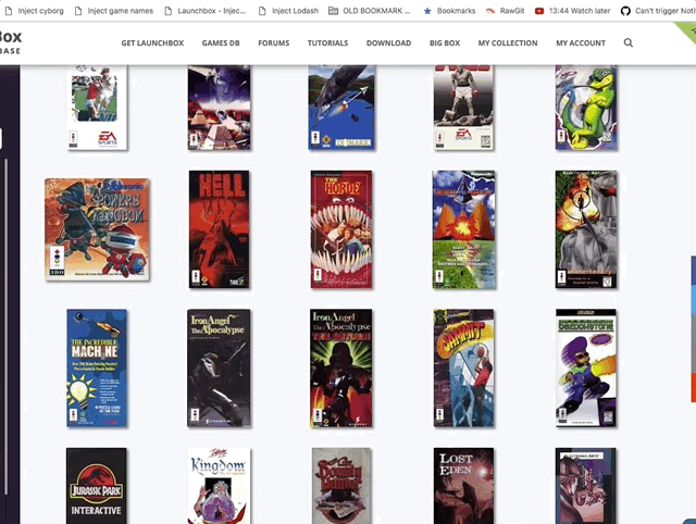 Hi Everyone! I found it really hard to search for games when looking at a console and none are expanded. I wrote a little script that writes the name of each game on top of it's cover so I'll be able to find games easier and even use the browser's search functionality on a console. Here's the script and how to use it: 1. Create a new bookmark in your favorite browser 2. Enter the following name: "Launchbox - inject names" 3. As the URL, enter the following code: javascript:(function() { $('.box-item').each(function(){ let qElm = $(this); let boxWidth = this.clientWidth; let imgWidth = qElm.find('img')[0].clientWidth; let boxHeight = this.clientHeight; let imgHeight = qElm.find('img')[0].clientHeight; let hSpace = (boxHeight - imgHeight) / 2; let wSpace = (boxWidth - imgWidth) / 2; let name = $.trim(qElm.next().find('h3').text()); qElm.append(`<div style="position: absolute;bottom: ${hSpace + 5}px;left: ${wSpace}px;right: ${wSpace}px;color: white;display: flex;align-items: center;text-align: center;justify-content: center;background: rgba(0, 0, 0, 0.5)">${name}</div>`); });})() I usually put this in my bookmark bar for easy access. Look at the gif for a quick demo. I hope someone else will find this useful ? Notice that it might take a while if your rom collection for a specific console is huge ?