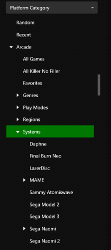 Just add Arcade as a platform or category (right click in the left pane area and option will come up). Once created, right click on the name of the platform, and then go to parents tab to move that platform under Arcade. Repeat for others. You do not have to reimport anything. I have something similar where Arcade is top level and then under "Systems" (which is a category) I have Sega Model 3, etc so one deeper level then you want. But same concept. You can also check multiple boxes under the "Parents" if you want that platform to show up under multiple categories but it doesn't dupe any games, just shows another entry. Make sure to uncheck "root" if you only want it to show up under the sub category.