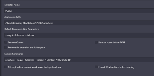 If just running ISO on your hard drive (and not via an actual CD player) then your setup should be something like this in LB: The error in your screen snap indicates that for some reason the emulator isn't getting the name/path of the ISO file. Double check you are not trying to launch a separate configuration file or have a conflict (typically stored in \PCSX2\inis). If you have a non-standard setup then may need to indicate in LB in the Default Command Line Parameters where your ini files are located: --cfgpath="Path": Specifies the configuration files path to use instead of inis. --cfg="CFGFile": Specifies the configuration file to use instead of PCSX2.ini (does not affect plugins). See here for more info Normally, you do not have to set these if running a standard PCSX2 setup so wouldn't add them if you haven't done any custom paths. Lastly, the "release" version (1.6) lags quite a bit behind, so might check what version of you have. Nightly versions (+1.7) are here. Just make sure you make a backup if using 1.6 and going to 1.7 since difference in plugins/etc. There also shouldn't be anything to change in the CDVD plugin.