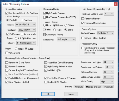 No worries. Added a couple screen snaps of my FP main settings. It actually isn't too bad to setup, but it is definitely not like an Atari 2600 rom set where you import, media all matches, if not download from LB. Done and dusted. It is mostly complicated because of the lack of consistent naming conventions and because you can have a zillion versions of the same table and by different authors. I would definitely not recommend importing a table "pack" first off (or mentioning table packs at the PB sites). Most I have seen have 20 versions of same table (go with highest version number tend to see fixes for table code) or for FP the physics XMLs are not included. I would step into it first. -