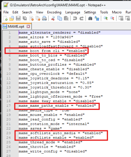 1) Yes, it works for me. RA with MAME standard core: 2) Using the base MAME core you don't need to move anything around from standard install of MAME arcade and MAME software lists. Bios files remain as for normal MAME. So you don't need to move the bios into System folder for RA. 3) MAME.ini for RA in system directory doesn't looks consistent. Should just point to standard MAME arcade ROMs folder and standard MAME software list set. If have CHDs separate then those as well. Example: 4) Then on your MAME options file for RA should have this which for SL the red boxes are key: Using above you can keep a normal MAME set and also use for RA. Because of the an issue/coding glitch you have to have updated copies of HASH XMLs and Samples within the MAME RA system folder (won't work pointing to MAME install) even though the intent of the RA "MAME_PATHS_ENABLE" was to be able to use all MAME normal paths. But at least for ROM MAME paths they can reside outside RA folder structure.