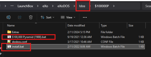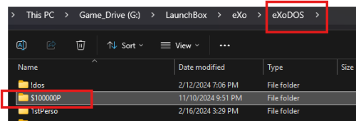 EXO doesn't need LB to run, it just makes it easier. See #5 below. You don't launch any of the batch files for EXO directly from DosBox. The batch files are designed to call the appropriate emulator in the Emulators folder (see #8) then spawn the program. The version of LB in the EXO package is pretty old. You should make sure you can even run LB in VM by just downloading most current free version and seeing if will run. LB does have various dependencies that on a Windows computer it will install automatically. In VM, not sure if that happens and without them LB won't run. I have run a Mac VM in Windows but not other way around. Don't set compatibility back to old versions. Also don't run LB in admin mode. Have no idea why OneDrive would be going and cloud storage, never seen that with Exo but not using lite version. If you want to run a program outside of LB that will be easiest to troubleshoot. Assuming you installed exo in paths it wants to see then you can go to the following directory (!dos), click on Install.bat and then after completed you can launch from the game batch file. No LB needed: The Install puts the files here: The exo auto installer can sometimes be wonky but on a new install it should be okay. Key is that EXO expects things in certain folders as batch files are used. Below is typical install folder setup for EXO. As long as the paths within the EXO folder are as it expects then the batch files will run. The key folders are the ExoDOS, emulators, and dosbox folders. Now whether this will all run inside a VM (or the EXO updater/downloader), I am somewhat doubtful but if you can run DosBox then potential. The key though is making sure your folders are correct and base install works. Running LB in the VM (assuming can get running) won't be very speedy. Space may also become an issue as you add media to LB. The full exodos package is about 800 GIGs. ExoDOS has a Discord so may ask there as pretty unique use case (and not really a LB issue if cannot run the base EXO package).