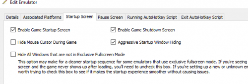 @DrybonzOdd. Even launching from RPCS3 directly outside of LB, if you have the exit thread checked then if you exit game it will close GUI. Is GUI remaining when launched outside LB? Also might check you don't have a custom config for games setup versus global and that those settings are not being applied. Easiest way is in RPCS3 is to rightclick on game in listing and will show if custom config present. When launching from LB (or really even directly) it will launch the RPCS3 game listing GUI and it will be under the full screen of the game. For LB, under the Startup Screen tab in LB, if I have "Hide All Windows not in Exclusive Fullscreen" and "Aggressive Startup Hiding" checked it will hide that underlying GUI that pops up momentarily so only the LB startup screen is shown (other than if needs PPU compiling). But even if I don't have either checked, the RPCS3 GUI will only pop up momentarily until the game goes into full screen mode and in which case the GUI is placed in background.