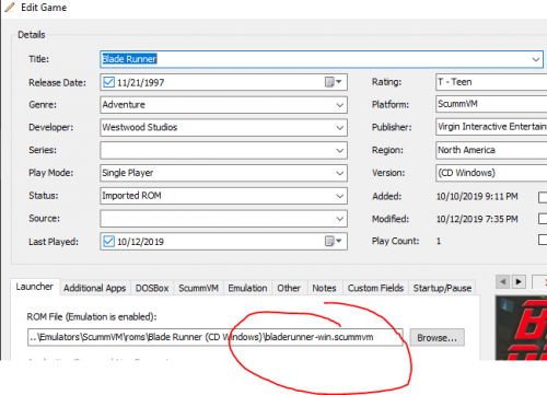 The version that comes with LB isn't updated yet to 2.1.0 (after all ScummVM was just finalized today). Additionally, the built in settings within LB will need to be updated to reflect the new codes that are supported in 2.1.0 which is why you don't see them in LB. LB wouldn't know which codes they were or what games were to be supported until ScummVM folks finalized things. Since you are not using batch files you can go another route in the mean time. Basically, you do as follows: 1) Add the new ScummVM emulator EXE path like any other emulator (version 2.1.0 downloaded from ScummVM site). 2) make sure to to check "don't use quotes" and the "use file name only without extension..." 3) In the default command line parameters insert command that points to location of your scummvm.ini which can be anywhere but in my case I keep with the EXE location rather in my User directory so it is portable: ScummVM -c "G:\Emulators\ScummVM\ScummVM\scummvm.ini" --no-console -f the -f just tells it to go to full screen. All other settings are taken from your INI file. 4) Go to the directory with a new game and make a text file with the name of the Game ID. In the case of Blade Runner, it is bladerunner-win. The extension can be anything but I use scummvm since that is also what Retroarch likes. If you open the text file and also insert the game ID (i.e., the same as title without extension) then Retroarch will also work in addition to normal emulator installed above. 5) Then add the "rom" like normal within LB by pointing it to the bladerunner-win.scummvm file. See below example. 5) If you want to find the game IDs for other new games just open up the ScummVM emulator and go to the game after you added it and click "Edit Game" and will see ID on first tab. Setting a dummy text file with the name will allow LB to launch the game with the above settings.
