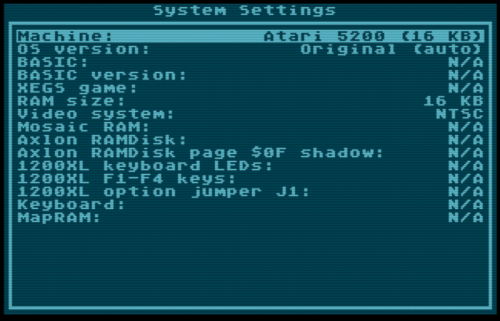 For the Atari 5200, check your retroarch-core-options.cfg file and look for this setting to make sure it says "5200" . atari800_system = "5200" Also check you have the required 5200.rom. Lastly, if the above are right, then load the core and while running hit F1. Should come up with a window like this and check System Settings are properly set to 5200. For the Jaguar, not sure on that. I never have seen that boot screen. Do you have the "Bios" option set to "on" in the RA settings? Might toggle if that is the case. Just a guess though. For the 7800, looks to me like maybe not correct firmware. When you go to the Core Information setting in RA, do you show the 7800.BIOS (U).rom as present? Again a guess since haven't seen that unless it is a corrupted ROM.