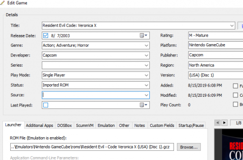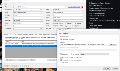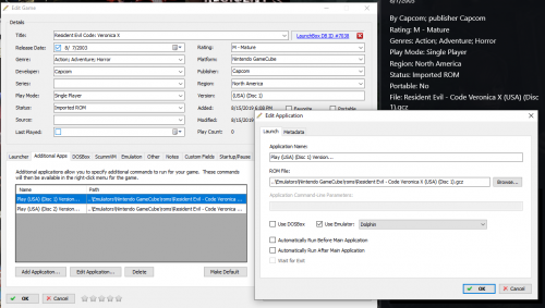 I have had this pop up on occasion and in my case always when imported game is an Additional App. It is odd because it seems to only happen with certain games and for no obvious reason (i.e., special character in name vs others that import fine). Deleting and re-adding doesn't fix the problem ones. Until I made my Sony PS1 dual disc games into one file PBP, it popped up there as well on few games (so not emulator/system specific). So two that I know for sure that this still happens are under the Nintendo GameCube system. These two games: Lord of the Rings, The - The Third Age (USA) (Disc 1).gcz Lord of the Rings, The - The Third Age (USA) (Disc 2).gcz Resident Evil - Code Veronica X (USA) (Disc 1).gcz Resident Evil - Code Veronica X (USA) (Disc 2).gcz LB will always try to re-import the 2nd disc again no matter how import even though the settings are fine and adds to the additional app as expected. It is like the Scan for Added Roms feature just doesn't see it. So here is a run through with Resident Evil game above. 1) Deleted game from LB. Here are the two files on drive: 2) Re-added both games with combine checked. All looks good 3) Looks good after import (not two separate files) 4) Double check the additional apps. All added okay. 5) Both look fine and will run as expected. 6) Now run the Scan for Added Roms and it pops up to add it again even though it is in the Additional Apps listing. A manual Edit Application and re-linking files once game added also won't fix. Sometimes I found a slight name change to both files will fix but that doesn't work all the time. In the case of Resident Evil above, I deleted the "dash" in file names and adjusted the Additional Apps and will do the same thing (try to reimport disc 2 after both are added). I remember looking at the XML files once trying to figure out what is different but couldn't see any pattern but nothing jumped out. Anyway, odd to be sure. Edit: tried a couple other things. Tried swapping Disc titles (i.e., Disc 1 is now Disc 2) to see if something peculiar with the file. Will still pick up "Disc 2" even though it is physically the Disc 1 image. Other thing tried is making the names "Disc A" and "Disc B". Same thing, now just keeps trying to re-import Disc B. -