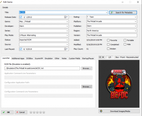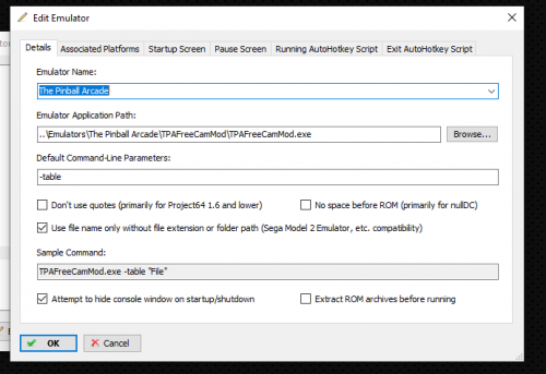 @drewjbxFor TPA, you don't have to use RL. Here is how have setup in LB with TPA purchased from Steam, but shouldn't make any difference as long as TPA is up and working outside LB since using TPAFreeCamMod.exe. The TPAFreeCamMod.exe needs to have the proper path in its Settings.ini file to the PinballArcade11.exe location. 1) Make sure you have the TPAFreeCamMod.exe and use that as your emulator application path. You can name the "emulator" whatever you want. You need to make sure to check the "Use file name only without extension or folder path...." Also note the -table command in command-line 2) Then setup "dummy" roms which are just plain text files with the name that TPA uses for launching: This is example of "rom" folder which plain text files. Note the name is key since that is what is used to pass to command line to launch table. The benefit here is that once have named can import into LB like any other roms and "in mass" through import tool. Will have to fiddle with the names to fix in the title once imported. Full list of game names Freecam needs (got this list from one of the pinball sites):