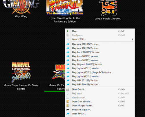 @fuzzman34 you might look at this site since goes into detail on each game as if it is working, as well as which ROM sets are needed (no ROMs on the site). For example, Marvel vs Capcom is a working game (and works in my set). Good for spot checking to see if ROM set has some issues. Otherwise, the ROM Manager route is needed to validate/check a set and see which files are missing. On the number of games issue, LB aggregates the clones/regions, so like neil9000 said ~3,000 working games will be counted/shown on a normal MAME import within LB excluding the non-arcade stuff. Once you import into LB, if you right-click a game entry, it will show the other associated games. So for example, the Marvel vs Capcom game has 10 other entries. Going into MAME directly, with a 210 set, the number of working games is ~13,000 inclusive of hacks, clones, regions, and the zillion casino games, etc. LB just rolls them up, but you don't have to do it that way if actually want to see entries separately rather than merged like below.