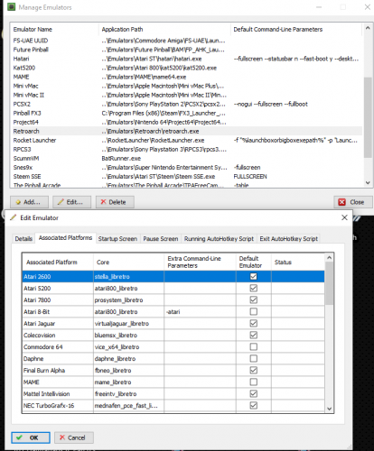 The emulator cores are selected as shown below in the edit emulator box. Select the core column and will allow to toggle to appropriate core. Make sure your platform titles match in the associated platform column and what you named in LB listing.
