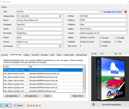 My guess is that it is there but the primary/default name used was a clone name. LB may be prioritizing the clone name. Might look and see if you have in your listing "Turbo Out Run" or one of the non-hack names listed here: http://adb.arcadeitalia.net/lista_mame.php?serie=442&arcade_only=0¤t_version=0 You can easily test as well but just doing a non-clone import with North America and seeing if imports (does on my install but I don't do clones).