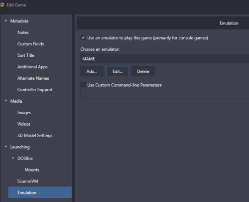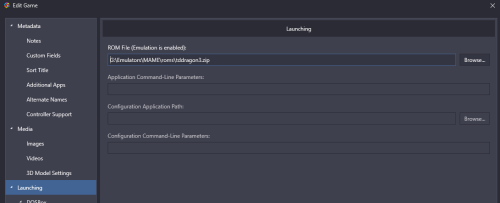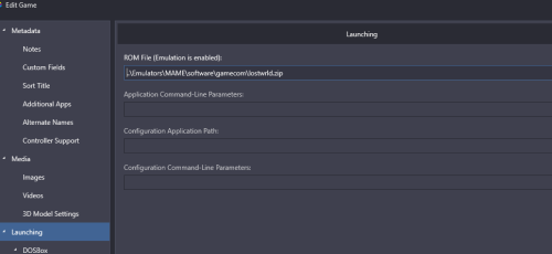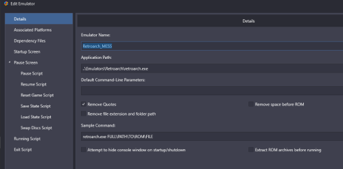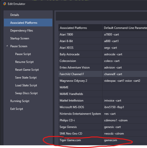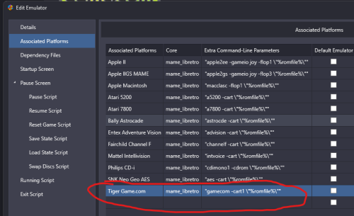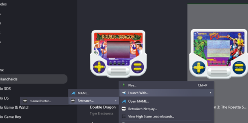Well, my bad, I didn't read your post carefully. I am going to backtrack a bit on what said above as just noticed you were talking game.com vs Tiger handhelds. You are specifically referring to game.com games which is a MAME Software List game vs the Tiger handhelds which are in the arcade set. Similarly you can set it up as follows to run via MAME and RA. I am using Lostworld Game.com game as example below. You point to your main MAME software list set for both RA and MAME and then you don't have to move any ROMS around (or combine). In this case, it now points to the Software List folder Game.com and the rom: If using MAME then under associated platforms. Note you don't have to use "cart1" if you have properly setup MAME folders with HASH folder and updated. MAME figures it out by Zip file name using the HASH xml. Or you can use "-cart1". For Retroarch it is a bit different for Software List games than it is for Arcade. I setup a separate entry for Retroarch Mess (or software list) emulator to make it easier to work as different check box settings needed. Then for Associated Platforms for RA: This is the entry. Note the spaces and double quotes as is key or won't work. "gamecom -cart1 \"%romfile%\"" Then you should have ability to launch via RA or MAME. As side note, Software List is another layer deep in complexity for RA MAME so my recommendation/preference is to use vanilla MAME particularly for software lists (plus gets goofy on borders/artwork with RA).