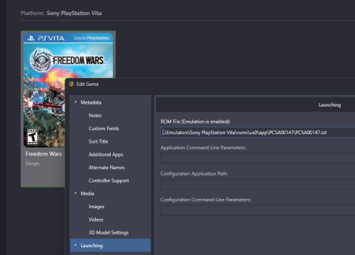 Place game ID (same name as folder) in a dummy text file in the folder with the eboot.bin. In this case PCSA00027.txt The emulator will only launch directly into a game if the Game ID is used. Setup your emulator in LB. Add the -F and -r switches to the Default Command Line entry. Make sure to check the boxes for remove quotes,extension/folder path are checked. Import the text file as a "rom". Manually override the name at the last step of import to indicate actual game title (in this case Freedom Wars). If you don't want to manually do the text files you can use this batch file placed in the ux0\app\ directory. If run from there it will take the name of each parent folder and create a text file in the game folder. idfile.bat