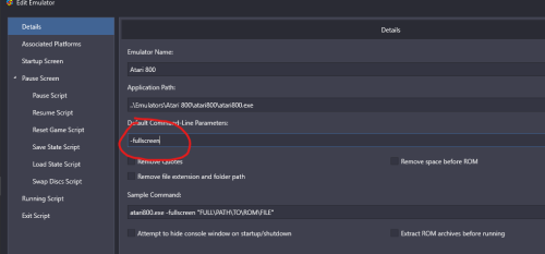 in your .atari800.cfg file namely this settings adjust video sizing within the file (or access via F1 in game, adjust , and save settings): VIDEOMODE_WINDOW_WIDTH=336 VIDEOMODE_WINDOW_HEIGHT=240 VIDEOMODE_FULLSCREEN_WIDTH=1920 VIDEOMODE_FULLSCREEN_HEIGHT=1080 VIDEOMODE_WINDOWED=0 VIDEOMODE_HORIZONTAL_AREA=TV VIDEOMODE_VERTICAL_AREA=TV VIDEOMODE_HORIZONTAL_SHIFT=0 VIDEOMODE_VERTICAL_SHIFT=0 VIDEOMODE_STRETCH=FULL VIDEOMODE_FIT=BOTH VIDEOMODE_IMAGE_ASPECT=REAL VIDEOMODE_ROTATE90=0 VIDEOMODE_HOST_ASPECT_RATIO=64:27 VIDEOMODE_80_COLUMN=1 or you can use command line entries as documented in the DOC folder in the USAGE.txt file. For example fullscreen command is: Best to stick to one way or the other (CFG file or command lines) just to avoid confusion. As far as controllers, yes it will work with controllers out of box; however, only as far as what the game supports for a "real" Atari 800. I don't be believe Atari 800 (the emulator) has input mapping to controller natively (it didn't use to which is why my default is Altirra). Thus, you will have to hit F4 on some games to start (Asteroids as example) or use an external mapping program to map a keyboard to controller button. Altirra has a mapping interface within the emulator that you can tell it to map the Atari 800 START button to a controller button.
