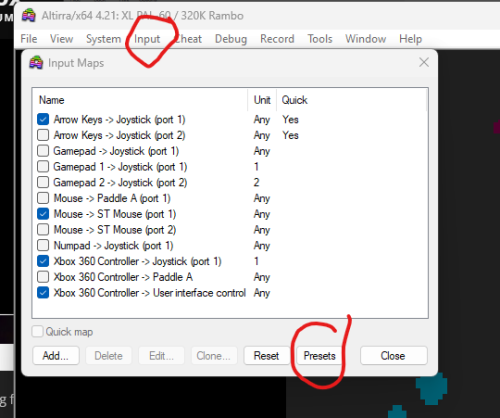 There is a help system in Altirra. It shows you the default commands (Start for example is F2). Help also shows how to setup controllers. Inputs are setup here and there are presets for XBOX controllers