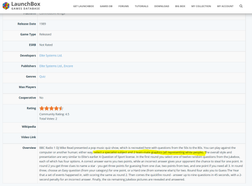 Thank you @sundogak! I can at the very least look for those terms and find the games that have those racial political opinions added to them. @Lordmonkus, I don't understand how stating that one wishes to "search the game database for specific terms (in my case terms in game info scraped from mobygames that aren't even from the original dev)" to be vague at all. So without the knowledge if which games have the scraped info I am unable to edit or request to make any changes until someone plays the game and finds it by accident. I also don't presume that it was made with malicious intent. Yet I also (literally on a daily basis) find the current state of racial politics to be nauseating to the extreme, especially against Caucasians. That's something I come to gaming to get away from. I don't go looking for brown people in my games (nor do I teach my children to) because I'm Mexican. Unfortunately most of these public databases are susceptible to carrying racial opinions that I would rather not have introduced into a hobby that is better off without it. The fact that devs from back in the day took pictures of folks around the office is a good thing. When I worked at Microprose in Alameda CA. back in the 90's they went around and asked for volunteers to have their pics taken for Falcon pilots. The last thing I want to see is someone at Mobygames point out that the majority of characters are white as if it's a bad thing. That shouldn't matter in any game. So the Moby editors are pointing out that only whites are represented is either a good thing or bad thing.. BUT why should it matter? Sorry if I sound aggressive about it, I don't mean to come off that way, I just detest race getting brought into things that should have absolutely nothing to do with it. I never met a dev that went into making a game with any racial intent and so would like to find a way to find that content and remove it before it ruins a good time gaming with someone's racial views.