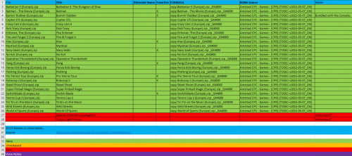 9. Hi all! I created an excel sheet to self help me sorting have/missing games for each platform. But i think also can help other people with its build, so i'm gonna share it. This post do not pretend to be a colaborative one, but if is there any bad info detected, just tell me and i will check and modify if necessary. This sheet also have an utility using the row "FORMULA", which can be used to copy games from romsets to another folder. The use is as simple as creating a .bat file with the files inside and a @pause at the end. Just an example: mkdir _GX4000 copy "Barbarian II (Europe).zip" _GX4000 copy "Batman - The Movie (Europe).zip" _GX4000 copy "Burnin' Rubber (Europe).zip" _GX4000 copy "Copter 271 (Europe).zip" _GX4000 @pause The rule i used to do the lists is based on a 1G1R with USA as priority and then Europe for the non USA Released Games. I only added Official Released Games. No Protos, Demos, Unlicensed, etc. Enjoy! Console Audit.xlsx
