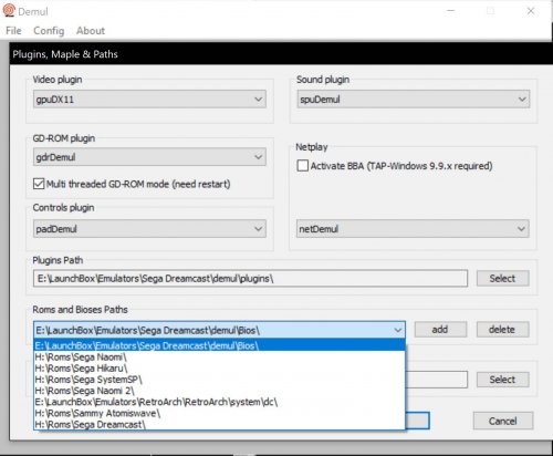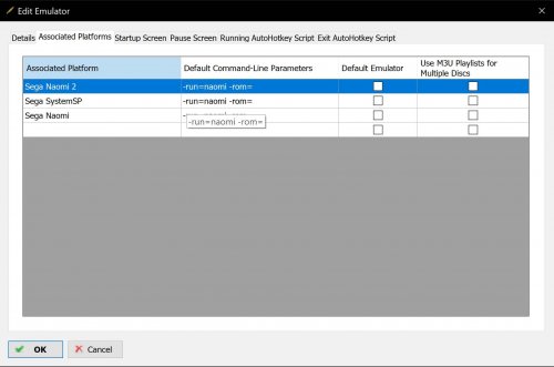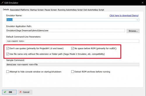 18. In Demul > Config > Plugins and Paths > Roms and Bioses Paths, add the paths to your (Naomi 2) roms and bioses. Then in LaunchBox add the command-line parameters: -run=naomi -rom= and tick all three checkboxes beneath. For Model 3 point to supermodel.exe as the emulator.