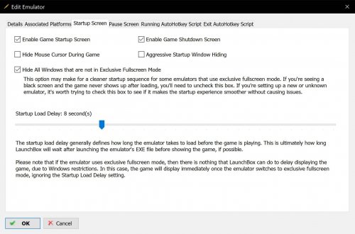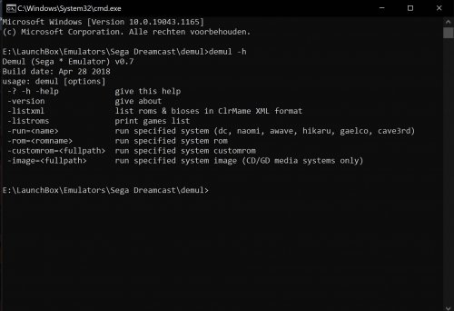 15. It could be because the first time an arcade games starts, the emulators creates a "nvram" files. Basically a file with the arcade boards bios / service menu settings. But anyway, you can hide that by using the LaunchBox startup screens. Not only is it mentioned quite a lot on this forum, but other forums as well. But if you want to know what command-line parameters an emulator supports, open a command prompt and go to the emulators folder. In the case of Demul type: demul -h (or demul -help) and Demul lists which command-line parameters it supports. I don't have any issues with Demuls sound. But I would start by verifying that Demul indeed runs at 60 fps (or 60 hz). In Arcade / Consoles systems sound is quite often linked to the game's framerate. So if the emulator does not reach the game's framerate it can sound garbled. This not necessarily has to be because your pc is not fast enough, but there could be a slew of other causes. - First the emulator configuration. Demul has 2 graphics plugins. gpuDX11 and gpuDX11old. I use the first one. Also there is a video setting called "Max Layers" . I have it set to 64, but having it on 128 can be demanding. - Then you have the Windows power management settings. - But maybe more important are the power settings in your graphics card control panel. In my case the Nvidia control panel > Manage 3D Settings > Program Settings > Demul. The Nvidia default nowadays is "Optimal Power" but in fact is quite aggressive in forcing graphics cards in their lowest clock state. Which is fine for browsing but for gaming "Adaptive" is better. (Sometimes even "Prefer Maximum Performance".) - And lastly, Demul hasn't been updated in over three years. Since Demul is a closed source emulator and seemingly not being developed anymore, I consider Demul a dead emulator. For Dreamcast, Naomi and Atomiswave I use the RetroArch Flycast core and only use Demul for systems that have no other emulator.