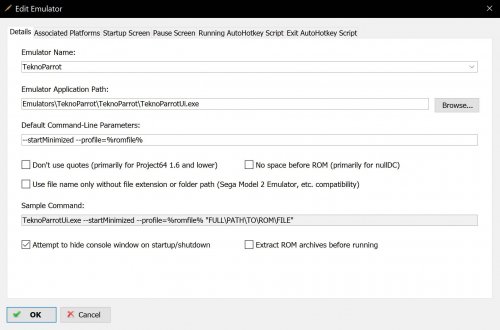 25. *Note* Before importing any TeknoParrot games into LaunchBox, first set them up and test them in TeknoParrot! First I have set up TeknoParrot with a custom platform name (Arcade Recent, to separate it from my Mame games) like this: I use the following command-line parameters: --startMinimized --profile=%romfile% and only the checkbox "Attempt to hide console window" is ticked. Then in the Associated Platform tab I entered my platform name. In LaunchBox > Tools > Manage Platforms I added my platform name and set "Scrape As" to "Arcade". Then importing the roms: I import .xml's from the TeknoParrot\UserProfiles folder. (When you have set up and configured your games in TeknoParrot, TeknoParrot will place a .xml in this folder.) I unticked "Show Default Platform" to find my custom platform name and leave "Scrape As" empty by clicking on the dropdown arrow and scrolling up to an empty field. Untick "Search for Metadata" for now. The only drawback from importing the TeknoParrot\UserProfiles folder .xml's as roms is, that after importing your games into LaunchBox you manually have to edit each game's title in order to scrape for metadata and media. (Right click your game > Edit. Edit the tile of the game and click the button "Search for Metadata". If meta data is found go to: Media > Images and click the button "Download Media".)