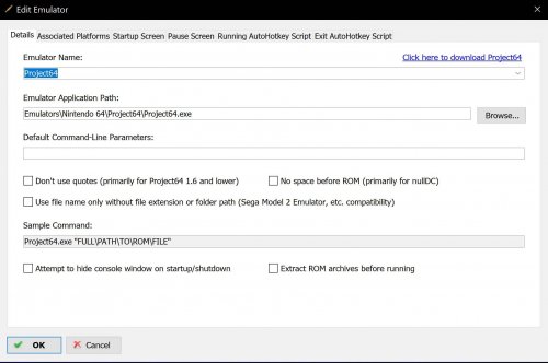 24. In Project64 > Options > Configuration have you ticked "Enter Fullscreen Mode when launching a Rom"? And in LaunchBox have you set up Project64 like this? To close Project64 from LaunchBox go to: Tools > Manage Emulators > Project64 > Running AutoHotKey Script tab and add: $Esc:: { WinClose, ahk_exe {{{StartupEXE}}} }