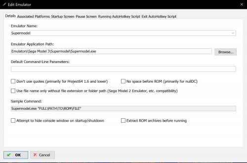 7. In your screenshots the paths for the Emulator Application Path in LaunchBox and your Sega Model 3 folder don't match? I don't know if your Z drive is a network drive, but I know some people experience problems with LaunchBox and network drives. *Edit* I just converted one of my Model 3 games from .zip to .7z and the .7z won't launch. Like I suggested, in LaunchBox first check your path to Supermodel.exe and then convert a game from .7z to .zip > change the rom path for your game in LaunchBox and see if your game will launch. *Edit 2* After posting the above comment I remembered responding too an earlier thread from you about setting up Supermodel. In that thread you wrote you got Supermodel working with zips. So I'm pretty sure your problem is about Supermodel not being able to handle .7z.