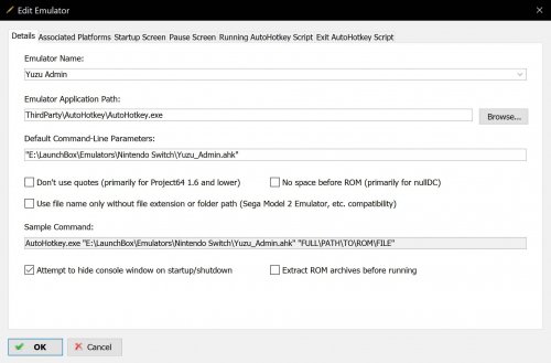 11. The way I found to run Yuzu as admin from LaunchBox without UAC prompt is convoluted and takes a few steps. 1. Create a new text file and copy/paste the below script to that text file. Save the text file as Yuzu_Admin.ahk (so with an .ahk file extension.) #NoEnv #SingleInstance SetTitleMatchMode, 2 SetWorkingDir %A_ScriptDir% FileRead, YuzuLauncherTempFile, YuzuLauncher_Default.ahk StringReplace, YuzuLauncherTempFile, YuzuLauncherTempFile, RomFile, %1% FileDelete, YuzuLauncher.ahk FileAppend, %YuzuLauncherTempFile%, YuzuLauncher.ahk Run, C:\Windows\System32\schtasks.exe /run /tn "Yuzu Admin" Process, Wait, yuzu.exe Process, WaitClose, yuzu.exe ExitApp 2. In LaunchBox create an emulator. For example Yuzu Admin. In the "Emulator Application Path" point to AutoHotkey.exe in LaunchBox\ThirdParty\AutoHotkey. In the "Default Command-line Parameters" field add the path to the Yuzu_Admin.ahk script between double quotes. 3. Create a new text file and copy/paste the below script to that text file. Save the text file as YuzuLauncher_Default.ahk (so with an .ahk file extension.) Make sure the created scripts (Yuzu_Admin.ahk and YuzuLauncher_Default.ahk) are in the same folder. #NoEnv #SingleInstance SetTitleMatchMode, 3 SetWorkingDir %A_ScriptDir% Game = RomFile Run, %A_WorkingDir%\yuzu\yuzu-windows-msvc\yuzu.exe -f -g "%Game%" Process, Wait, yuzu.exe Process, WaitClose, yuzu.exe ExitApp $Esc:: { WinClose, ahk_exe yuzu.exe ExitApp } Before we continue, first an explanation of what the scripts do. The Yuzu_Admin.ahk we added to LaunchBox as an emulator, in the first part takes the YuzuLauncher_Default.ahk script and adds the rom name and file path then saves the script as YuzuLauncher.ahk. The second part starts the Windows Task Scheduler task we yet have to create. The by YuzuLauncher_Default.ahk script created YuzuLauncher.ahk script is what we are going to add as a Windows Task Scheduler task and is executed with admin privileges. It starts Yuzu with the -f -g command-line parameters and the path to the rom file. It also has the LaunchBox exit script for Yuzu in it. 4. Then create a Windows Task Scheduler task. I am not going in to the details right now how to create a scheduled task because I assume you know how to do that. In the "Application Path" of the task point to LaunchBox\ThirdParty\AutoHotkey\AutoHotkey.exe and in the command-line field add the path to YuzuLauncher.ahk between double quotes. (in my case "E:\LaunchBox\Emulators\Nintendo Switch\YuzuLauncher.ahk"). Make sure to tick "Run Task with highest priority". Then go back to the Yuzu_Admin.ahk script and in the line: Run, C:\Windows\System32\schtasks.exe /run /tn "Yuzu Admin" replace Yuzu Admin with the name of your task. Of course you must set up your Switch games to use the "Yuzu Admin" emulator. *Note* I don't intend this write-up as a guide. More a proof of concept because in my opinion something like this is more for advanced users. The scripts reference script names: (Yuzu_Admin.ahk and YuzuLauncher_Default.ahk) so when copy/paste/saving the scripts, you HAVE to save them with those names. Anywhere a path is mentioned (in setting it up in LaunchBox or the scripts themselves), the paths must be edited to reflect your setup. *Note 2* All this is to run an emulator (Yuzu in this case) with Admin Privileges, no UAC prompt and still being able to exit the emulator with Escape from LaunchBox while LaunchBox provides the rom names and file paths. Because this setup right here is quite convoluted, I am curious if someone knows of an easier way. *Edit* TLDR: Add a script to LaunchBox as an emulator that passes the rom name and file paths to a second script. The second script starts the emulator with those rom names and file paths, but is added to the Windows Task Scheduler to be executed with admin privileges.