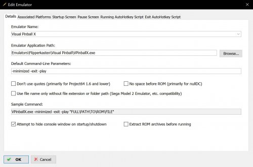 14. Visual Pinball X does not need to run with admin privileges. If you right click VPinballX.exe > Compatibility, make sure "Run as Administrator" is unticked. I only have a handful of tables in Visual Pinball X and do not recall seeing that message, but in LaunchBox I have set up Visual PinBall X like this: With command-line parameters: -minimized -exit -play