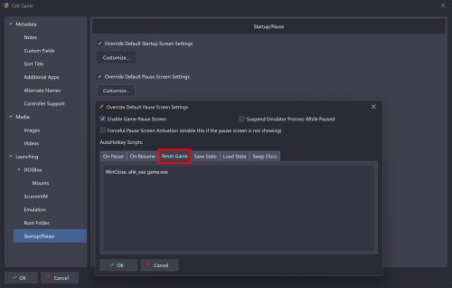 25. If you just want to close the game with your controller or Escape you could add a script as an additional app to your game. But if you absolutely want close the game via the LaunchBox pause menu I can only come up with sort of a work around. Right click your game > Startup/Pause > tick "Override Default Pause Screen Settings" > Click "Customize" > Tick "Enable Game Pause Screen". As you said, there is no "Exit Game" section. But you can put an exit script under the "Reset Game" tab. So, this is more of a work around because for exiting your game you have to select "Reset Game" from the pause menu. NOT "Exit Game".