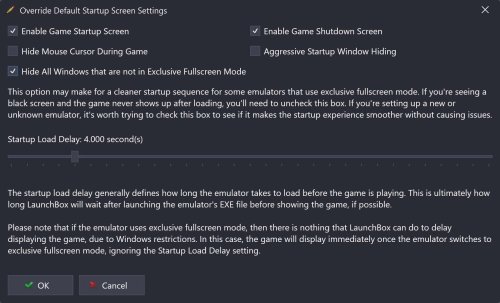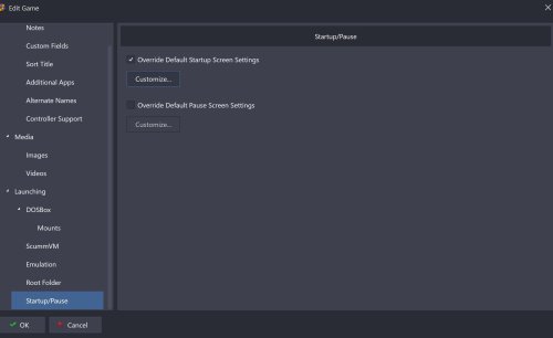 5. Not all TeknoParrot games / modules use fullscreen exclusive mode. So instead of using the LaunchBox > Emulator > TeknoParrot > Starup Screen settings, I find it best to set up the startup screens per game. Right click your game > Edit > Edit Metadata/Media > Startup/Pause. Tick "Override Default Startup Screen Settings" and click "Customize". Also, in the LaunchBox TeknoParrot emulator settings, you can add the command-line parameter: --startMinimized and see if that makes a difference.