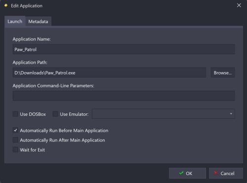 15. @sirgubster9 Try the following script. #NoEnv #SingleInstance SetTitleMatchMode, 3 SendMode Input SetWorkingDir %A_ScriptDir% WinWait, Paw Patrol Configuration WinActivate Sleep, 500 ControlSend, Button3, {Enter}, Paw Patrol Configuration WinWait, Paw Patrol ahk_class UnityWndClass WinWaitClose ExitApp $Esc:: { Send !{F4} } How to add the script as an additional app to your game in LaunchBox. Perhaps the easiest way: Find a location on your computer where you want to save / keep the script. As I have installed my Windows games outside of the LaunchBox folders, I keep my scripts for Windows games in the LaunchBox\Games\Windows folder. Right click somewhere in the folder --> New --> Text Document. Open the new text file in a text editor and copy / paste the script. Save --> Give your script a name and save it with an .ahk file extension. In my example I named it Paw_Patrol.ahk. Now go to the LaunchBox\ThirdParty\AutoHotkey folder and copy AutoHotkey.exe to the same location as where you keep the script. Rename AutoHotkey.exe the same as you have named your script. Like this: Now go to your game in LaunchBox --> right click --> Edit --> Edit Metadata / Media --> Additional Apps --> Add Application. - Give your additional app a name. In my case I named it Paw_Patrol. - Browse to the folder where you have Paw_Patrol.ahk and Paw_Patrol.exe. Select Paw_Patrol.exe. - Tick "Automatically Run Before Main Application". *important* Now you should be good to go. Alternatively you could compile the script to an executable and add that executable to LaunchBox as an aditional app. *Bonus* Completely hide the Paw Patrol launcher with the LaunchBox / BigBox startup screens. Use this script: #NoEnv #SingleInstance SetTitleMatchMode, 3 SendMode Input SetWorkingDir %A_ScriptDir% WinWait, Paw Patrol Configuration WinActivate Sleep, 500 ControlSend, Button3, {Enter}, Paw Patrol Configuration WinWait, Paw Patrol ahk_class UnityWndClass WinSet, Bottom, , LaunchBox Game Startup WinWaitClose ExitApp $Esc:: { Send !{F4} } Add the script to LaunchBox as described above. But for the LaunchBox / BigBox startup screens to work correctly with Paw Patrol, you must take one extra step: Right click your game --> Edit --> Edit Metadata / Media --> Startup/Pause. Tick "Override Default Startup Screen Settings" and click "Customize". Here tick: "Enable Game Startup Screen", "Enable Game Shutdown Screen" and "Hide All Windows that are not in Exclusive Fullscreen Mode." Set the Startup Load Delay slider to the time it takes to load your game.